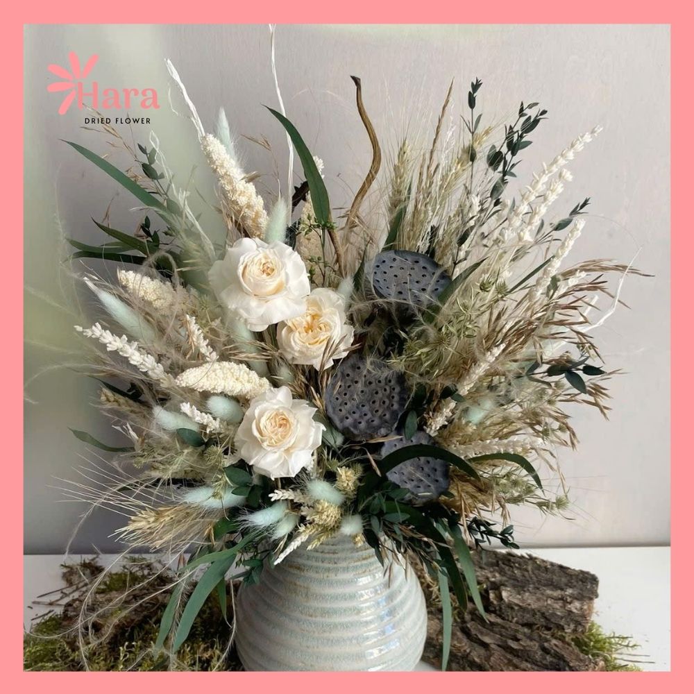 | Chất liệu hoa | Hoa khô tự nhiên (lau sậy, bông, cỏ khô, hoa điểm) |