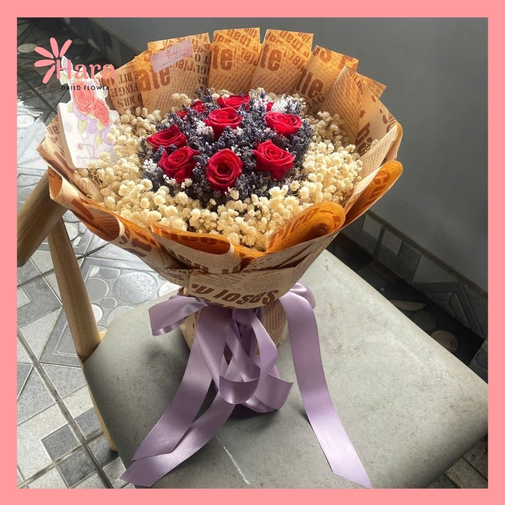hoa hồng đỏ nổi bật, hoa lavender khô và hoa baby khô. Sự phối hợp màu sắc độc đáo giữa đỏ, tím và trắng tạo nên