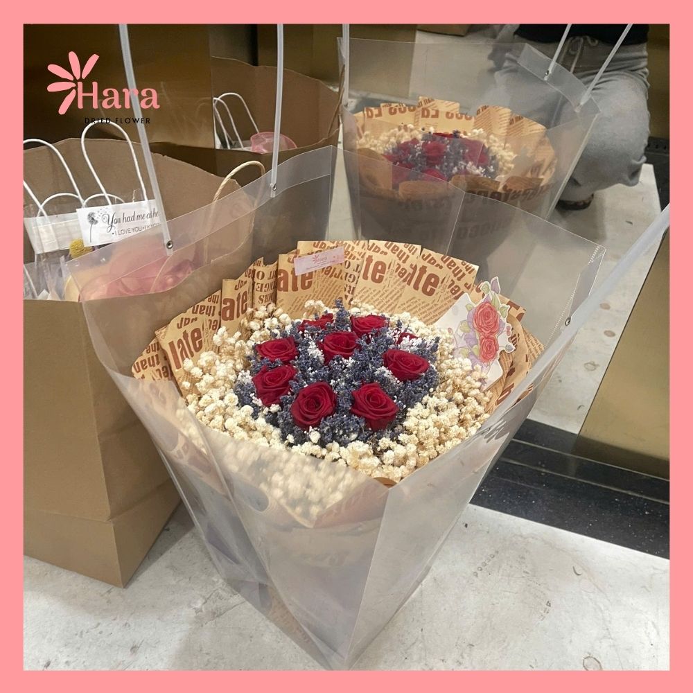 - Chất liệu gói: Giấy gói hoa cao cấp, nơ lụa trang trí