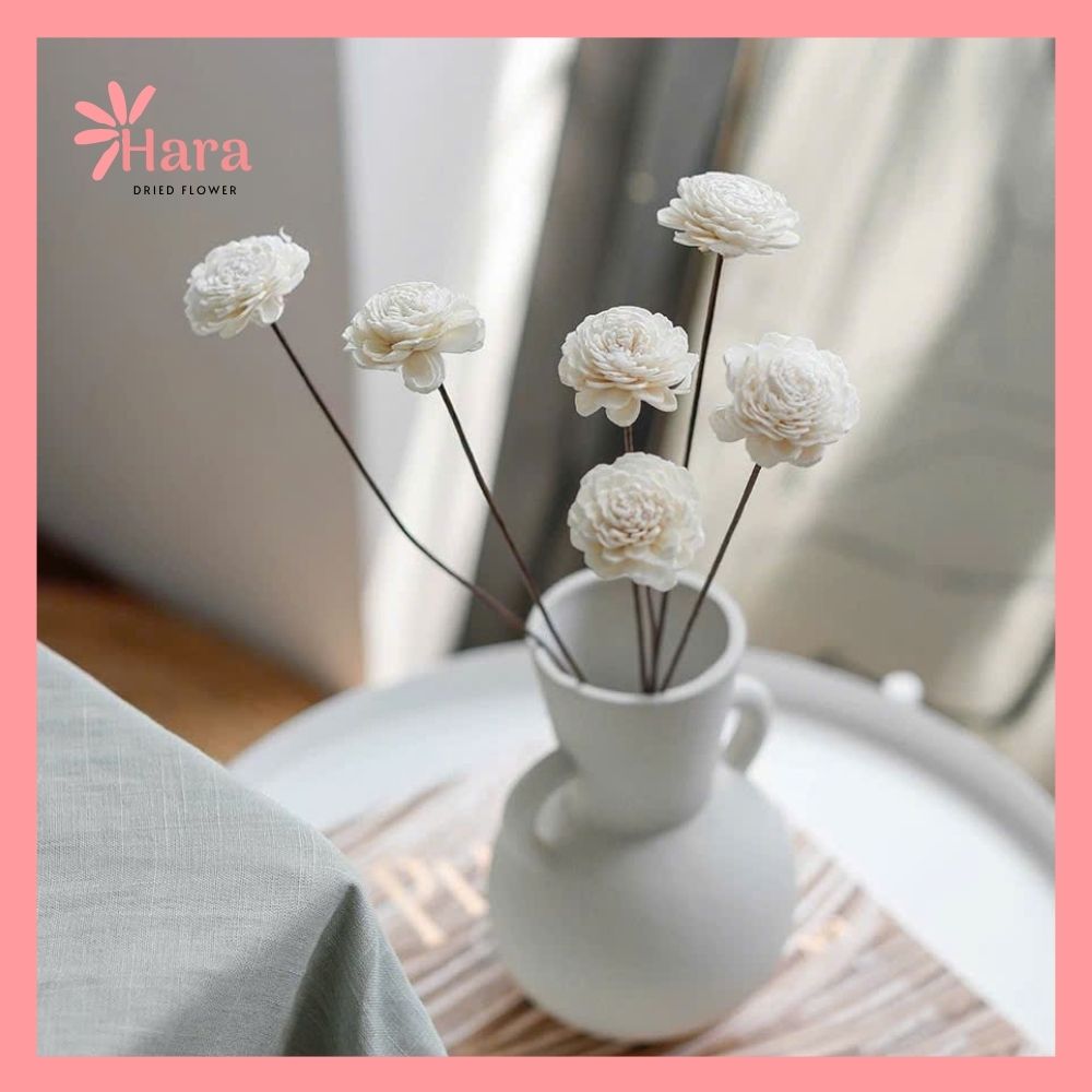 Khác với hoa khô tự nhiên, hoa sola được chế tác thủ công từ gỗ cây sola – một loại vật liệu tự nhiên nhẹ, mềm, dễ tạo hình, giúp giữ form hoa lâu dài và không bị hư hỏng theo thời gian.