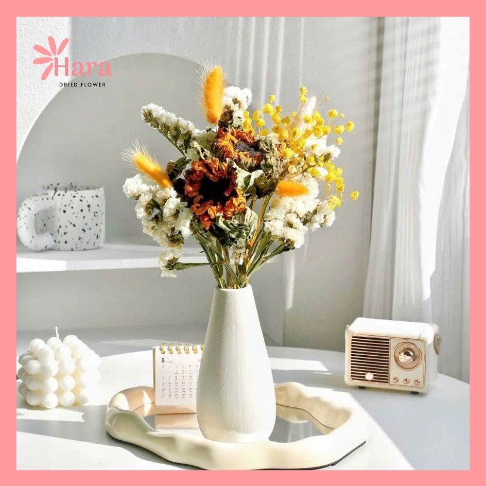 Sản phẩm bao gồm các loại hoa khô được phối màu hài hòa, cắm sẵn trong bình gốm cao cấp, giúp tiết kiệm thời gian mà vẫn đảm bảo tính thẩm mỹ cao.