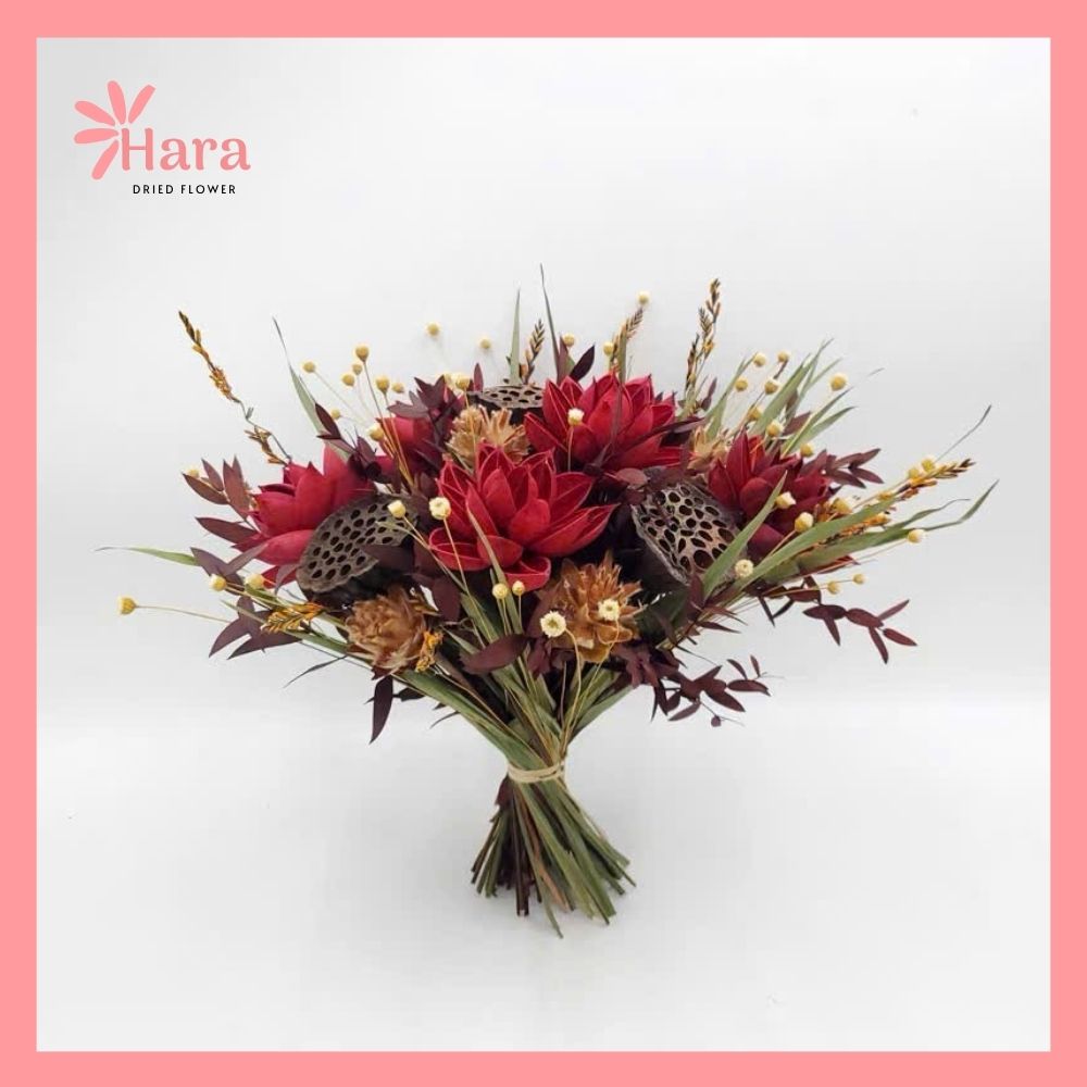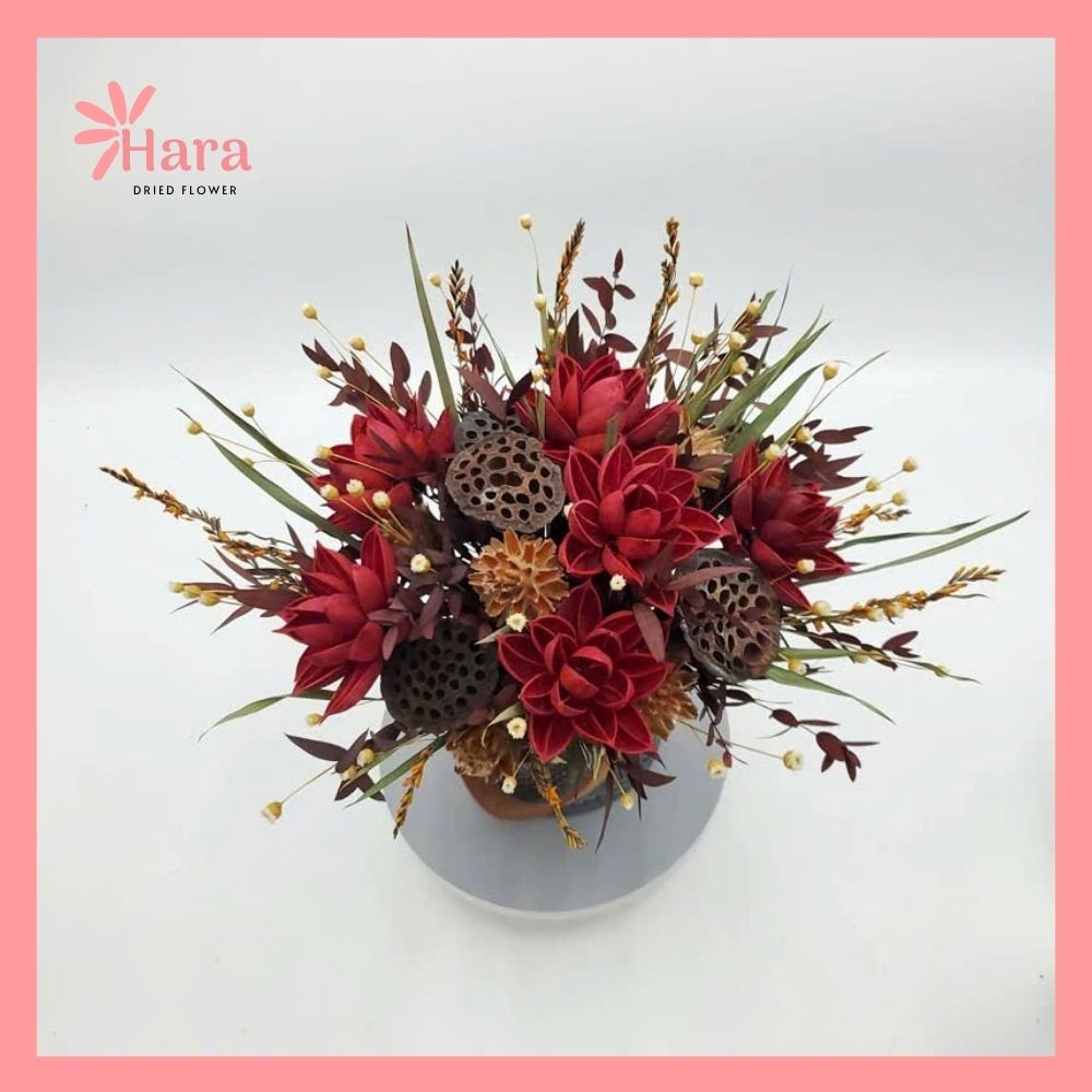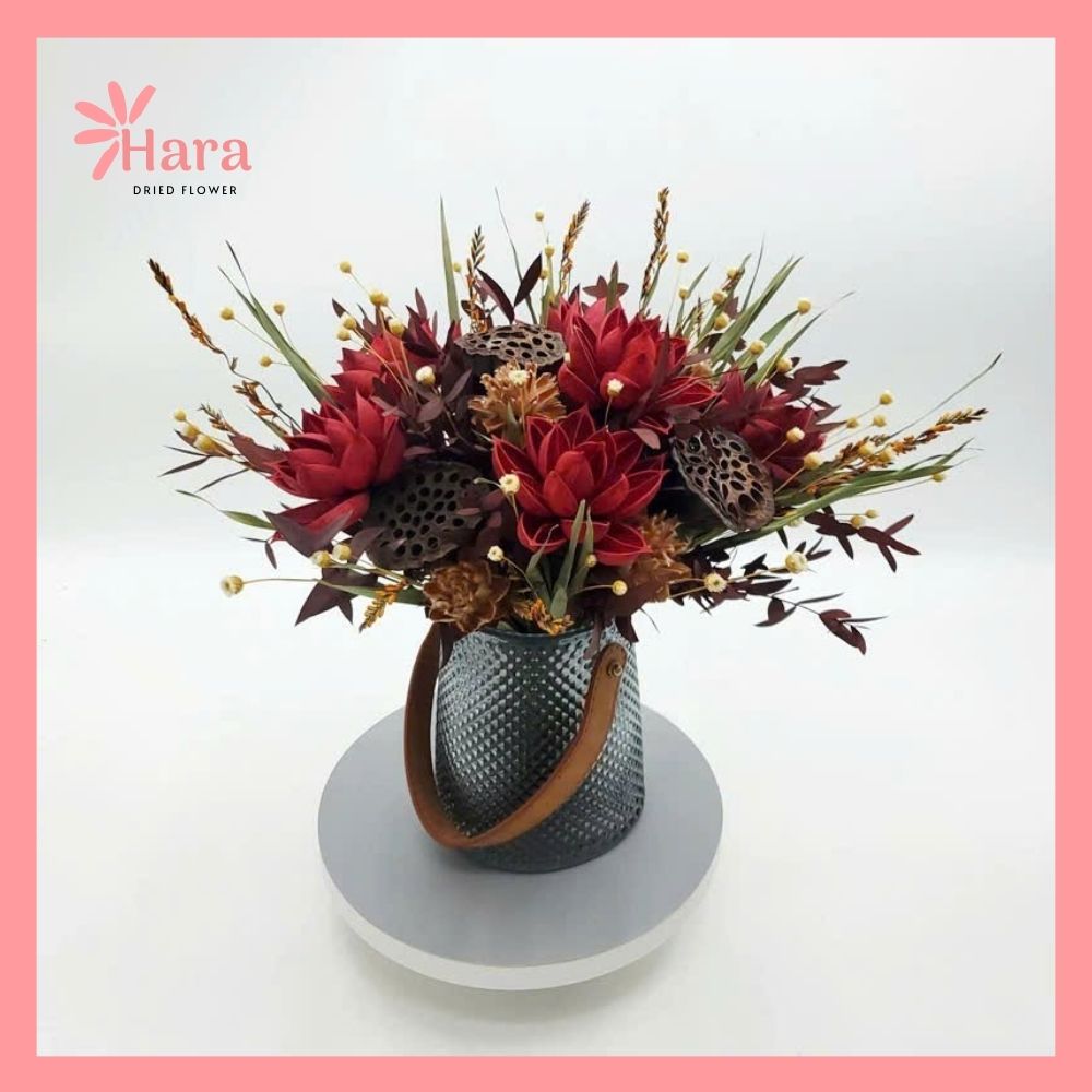 - Hoa khô màu đỏ đậm (tương tự protea hoặc hoa gỗ) làm điểm nhấn trung tâm