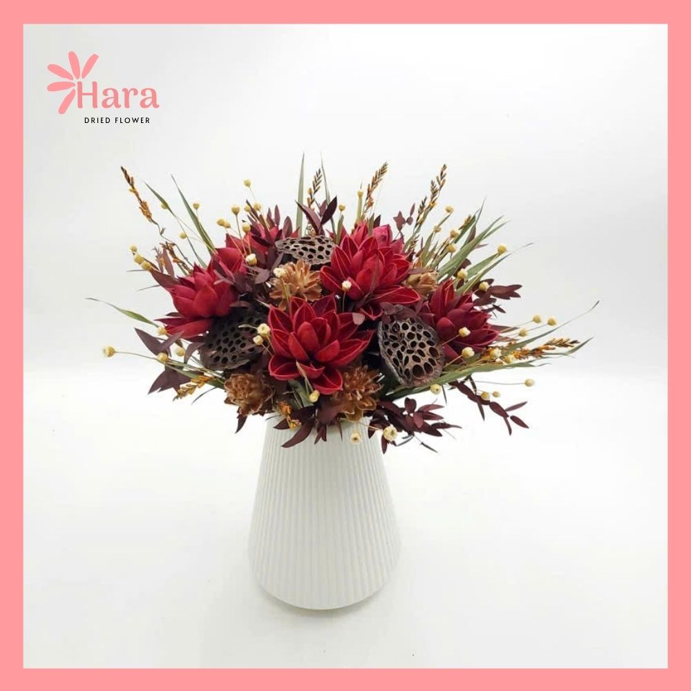 Set hoa khô cắm bình Hara96 là sự kết hợp hoàn hảo giữa các loại hoa khô cao cấp với tone màu đỏ rượu vang sang trọng.