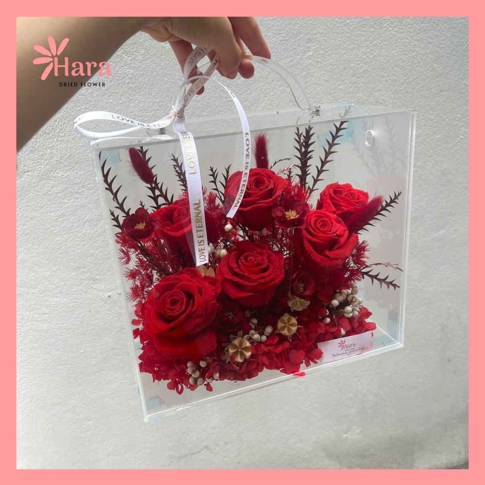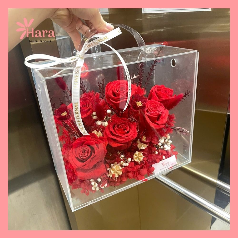 Vali hoa khô Hara HV09 là sản phẩm decor và quà tặng cao cấp, nổi bật với thiết kế hộp mica trong suốt sang trọng, bên trong là sự kết hợp tinh tế của hoa hồng đỏ và các loại hoa khô trang trí.
