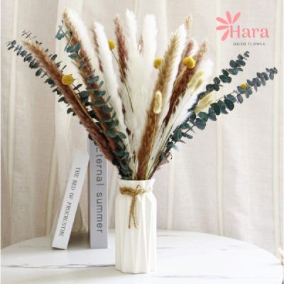 Các loại hoa khô có thể kể đến như lá cọ khô, cỏ lau, hoa Protea như Banksia, Thảo đường hoàng đế, Thảo đường nữ hoàng, hay các loại bông cỏ có độ bền cao như cỏ đuôi thỏ, phalaris, lúa mì, lúa mạch. Những loài hoa này không chỉ đẹp mà còn mang lại cảm giác nhẹ nhàng, thanh thoát, phù hợp với nhiều phong cách thiết kế nội thất khác nhau, từ cổ điển đến hiện đại.